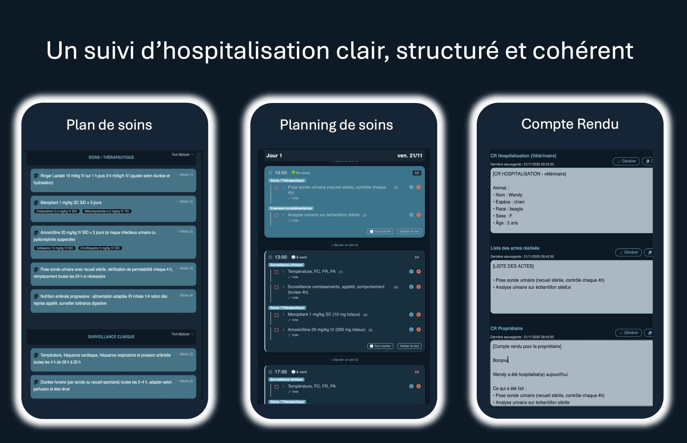 Accueil Notre savoir-faire Nos produits Comment procéder Nous contacter FR EN SpotiVET+, le 1er logiciel de suivi d’hospitalisations vétérinaires, structuré et automatisé Un plan de soin vétérinaire cohérent, une timeline organisée par heures et par journées d’hospitalisation, un compte rendu complet. Plan de soin prêt dès l’admissionSpotiVET+ propose un plan cohérent selon les informations d’entréeTout est ajustable: soins, doses, fréquences… Vous gardez la main sur chaque élément Timeline pré-paramétrée selon votre organisationLes soins sont automatiquement répartis par heures et par journéesValidation simple des soinsNotes internes Historique automatique Compte-rendu pour vous, vos confrères et vos clientsLe CR est généré à partir des actes réellement effectués Vous modifiez et complétez librement Les éléments cliniques regroupés au même endroitTº, FC, FR Hydratation, appétit, douleur… Un dossier clair, cohérent, traçable Soins horodatés Modifications conservées shield-check-solid Sécurité et conformité Toutes les données sont hébergées en France, dans un cadre réglementaire strict Votre expertise. Notre assistance cliniqueSpotiVET+ accélère votre travail sans jamais décider à votre place. Chaque soin, chaque ligne reste modifiableSpotiVET+ prépare les éléments chronophages à partir de votre logiciel métier SaaS Automatisation intelligente du dossier Plan de soins Planning des hospitalisationsCompte-Rendus Une hospitalisation homogène, même à plusieurs Soins horodatés Modifications conservées Assistance contextuelle, sans jamais décider à votre placeVous ajustez, complétez ou supprimez selon votre protocole Répond aux besoins réels des cliniques Hospitalisations Suivi structuréCohérence de l’équipe Continuité des soins Rotation des équipesInformations centraliséesTimeline de suiviTransmission fluide Pression de tempsPlan initial pré-organiséSaisie accéléréeCR généré à partir des soins réalisés Tarifs SpotiVET+ du suivi des hospitalisations en cliniques vétérinaires 1€ / hospitalisation/ jour◆ Facturation uniquement sur les jours réellement enregistrés ◆ Adapté aux petites et grandes structures +10€ / mois (optionnel)◆ Pour l’intégration avec votre logiciel métier ◆ Création automatique des hospitalisations CONTACT MENU ACCUEILNOTRE SAVOIR FAIRENOS PRODUITSCOMMENT PROCÉDERNOUS CONTACTERFREN JuridiqueMentions LégalesPolitique de confidentialité